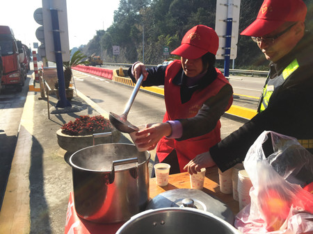 圖為工作人員在備熱飲品 當天是入冬以來最冷的一天,收費崗亭周圍氣溫達到零下4度。該所員工身穿耀眼的“紅馬甲”,面帶微笑,在車道安全島內搭起臨時“便民服務臺”,頂著嚴寒為過往司乘人員遞上一杯杯滾燙的姜茶與紅豆湯,并提醒司機朋友天冷注意保暖。 “姜茶暖我身、服務心貼心??!”一位司機師傅接過姜茶不由地詩意起來。 “你們服務態度真好,有禮貌,充滿熱情,這么冷的天,能有一杯熱水是多么幸福的事情??!”另一位司機朋友一臉笑意地稱贊道。 他們的友好回應讓員工們忘了寒冷,也給了大家提供更貼心服務的動力。