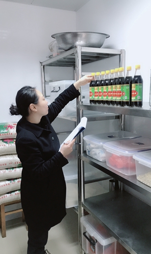 圖為工作人員檢查食堂用品 此外,工作人員每周將不定期對食堂內(nèi)外環(huán)境、倉庫存儲擺放、操作間衛(wèi)生情況、餐飲具消毒清洗、從業(yè)人員采購登記、一日三餐留樣制度等進行檢查,并制定員工就餐登記要求,提前登記用餐人數(shù),改變以往不就餐又不打招呼的現(xiàn)象,大大減少了不夠吃與浪費食材的現(xiàn)象。