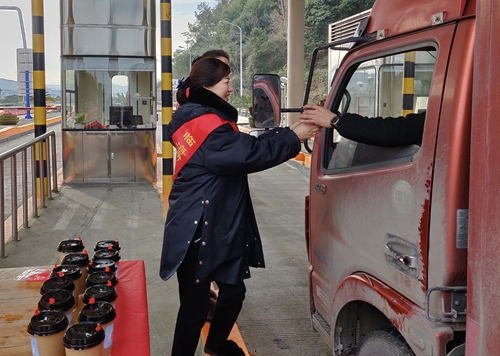 活動(dòng)當(dāng)天,雖然氣溫較低,但是在臨海南收費(fèi)所入口處,身著紅色綬帶的志愿者們依然熱情地為過(guò)往司乘人員遞上一杯杯滾燙的姜茶,并向過(guò)往大貨車駕駛員發(fā)放優(yōu)惠政策宣傳單。