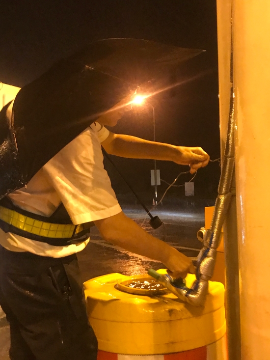 8月9日2122分,風雨越來越大,臨海南收費所車道水管被狂風吹隨意搖晃,當班收費員李俊杰不顧狂風暴雨,第一時間拿上鐵絲冒雨捆綁,防止砸到過往車輛,保證了車道安全暢通。
