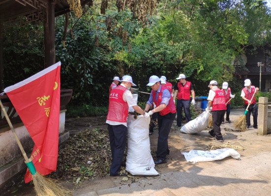 圖為打掃現場 上午8點半左右,志愿者們帶著掃把、鐵鍬等工具到達九峰公園,在黃巖青年志愿者的帶領下,來到劃分的平臺區塊。受9號臺風“利奇馬”影響,公園內不少樹木倒地,枯葉遍地。志愿者們帶著手套,用掃把、鐵鍬將平臺區域內堆積的落葉和樹枝進行裝袋清理。小的樹枝用草繩捆扎;拿不動的樹枝,用鋸子鋸斷了抬走;鐵鍬不好裝袋,就用手去捧。烈日酷暑下,志愿者們不顧汗流浹背,經過兩個多小時的努力,共清理出40多袋垃圾,大家用雙手還公園一片美。