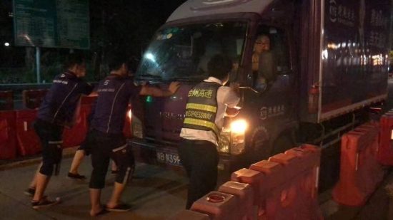圖為收費員幫助司機將故障車輛推出車道 8月15日凌晨1點多,溫嶺西收費所征費二班安全員在日常巡邏時發(fā)現(xiàn)一輛小型貨車停在進口內(nèi)廣場,在詢問司機后得知車輛因出現(xiàn)故障導(dǎo)致無法發(fā)動。安全員當(dāng)即叫來旁站人員,與兩個司乘人員一起用力,慢慢地將該車推出車道。在婉拒了司機遞香煙的好意后,安全員囑咐司機盡快聯(lián)系人員前來解決,后回到崗位繼續(xù)工作。