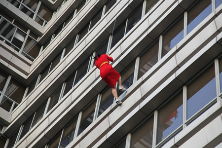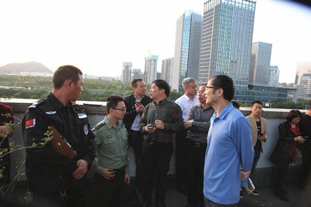 圖為演練前集團(tuán)安全總監(jiān)項(xiàng)同富介紹高層緩降逃生設(shè)備 培訓(xùn)結(jié)束后,參會(huì)人員集體到集團(tuán)大樓5樓外平臺觀摩高層緩降逃生演練。在演練中,2名模擬被困人員先后使用高層緩降逃生設(shè)備從16樓窗口平安緩降逃生到5樓平臺。之后通過演練和講評,大家進(jìn)一步熟悉了高層緩降逃生設(shè)備及使用方法,拓展了高層建筑逃生思路。 陳科