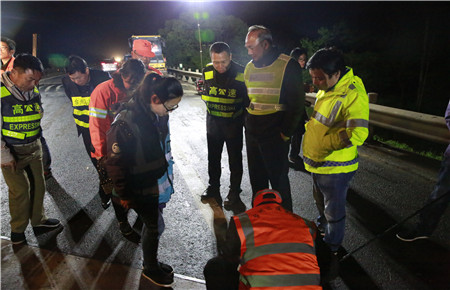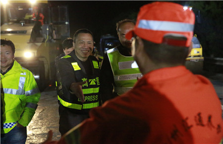 路面養(yǎng)護施工已經(jīng)第五天,當晚計劃完成K1655+897-K1656+943之間860米的路段罩面,銑刨6個橋頭。工人們每天夜出晝伏,持續(xù)的徹夜工作,違反生理規(guī)律、勞動強度較大,體力精神上都比較辛苦。盡管張建平在此期間一直參加黨校學(xué)習(xí),但還是百忙之中特地抽時間到施工現(xiàn)場為工作人員加油打氣。