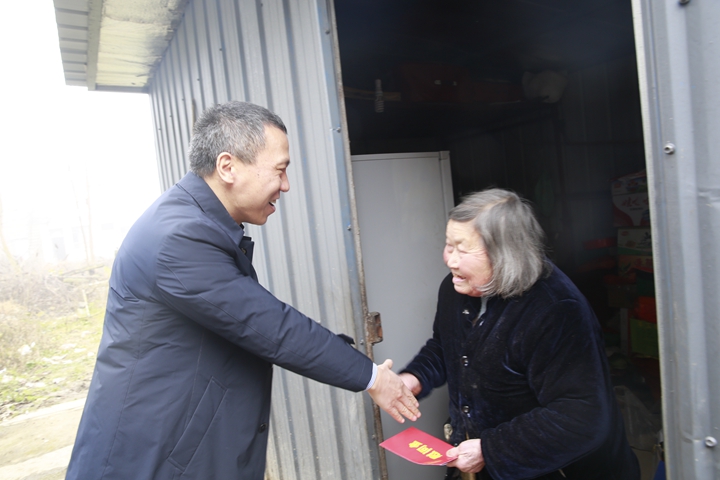 圖為集團(tuán)總經(jīng)理張建平走訪慰問老人鮑于朝