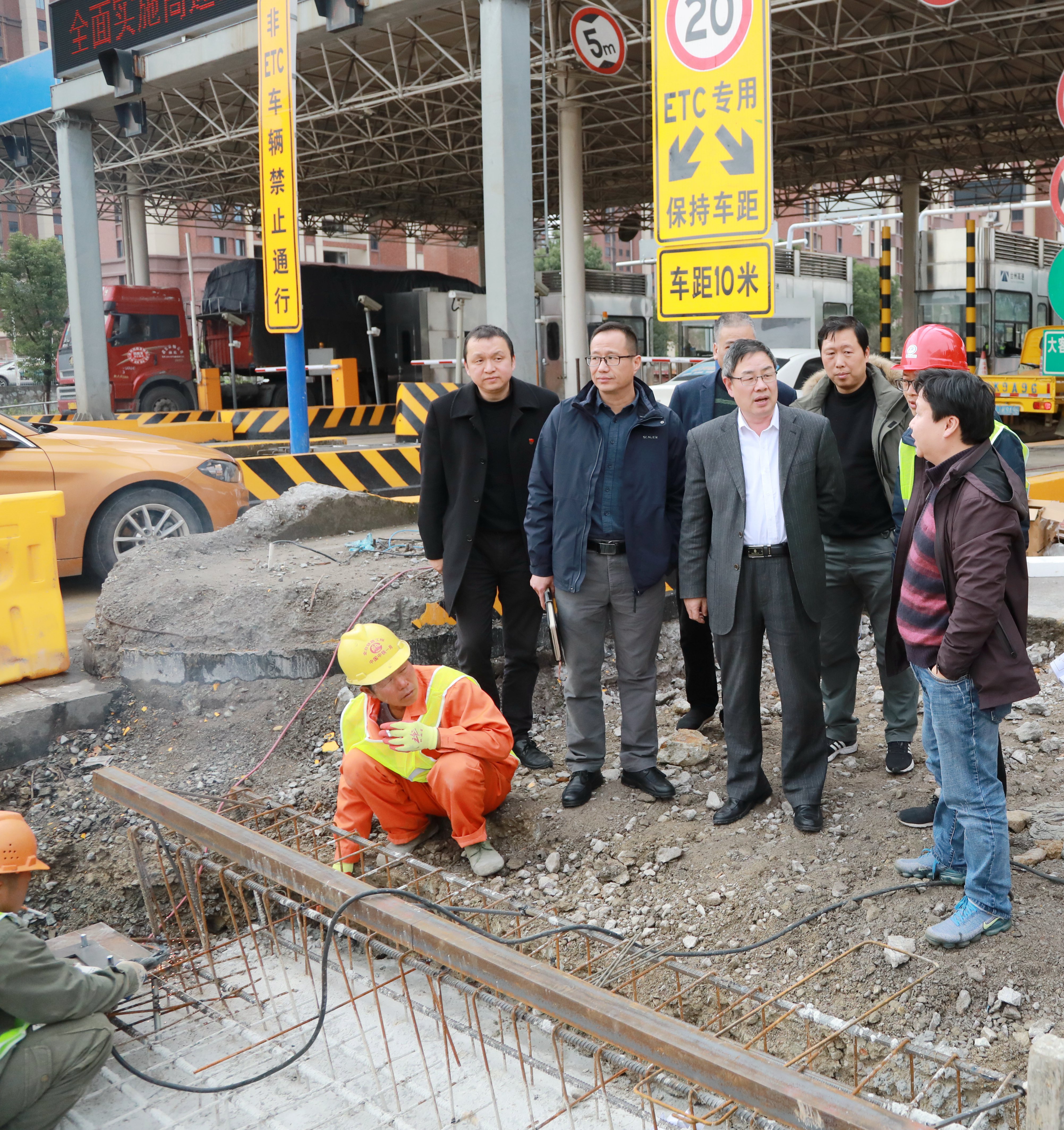 圖為陳文波在收費所混合車道施工現場了解施工進展情況 在臺州收費所和溫嶺西混合車道施工現場,陳文波詳細了解施工進展情況。在溫嶺西收費所,陳文波了解內廣場入口車輛調頭情況。在臺州收費所免費辦理ETC現場,陳文波與前來辦理ETC業務的駕駛員親切交談。