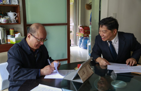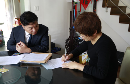 圖為原市人大副主任胡宣義妻子簽訂股權轉讓協議 11月14日上午,集團總經理助理項同富繼續上門服務,為離退休老干部胡宣義夫婦辦理股權轉讓手續。 沒等項同富介紹完此次股權收購的背景情況,胡宣義便“搶”先簽下了轉讓協議書,還著急召喚家中的另一位股東(他的妻子)過來簽字。