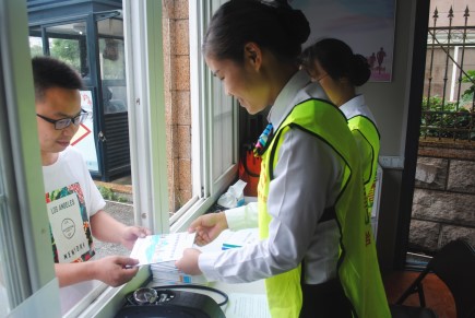 在位于黃巖區自力電影院對面的志愿服務亭里,臺州收費所志愿者服務隊的成員們,一邊學習如何操作充氣設備,一邊熟悉服務內容,并向市民發放《臺州市市民文明手冊》等。對于自己的志愿者服務工作,大家一臉自豪。就在隊員們分頭忙碌時,來了兩位外地口音的路人,詢問附近有沒有網吧。大家熱心指路,但這兩人還是一臉茫然,志愿者盧蒙莎就熱心地陪著兩人,穿過馬路,在一個巷子里的找到網吧。志愿者金愷,今天早班一下班,顧不得休息,就急著趕到了服務亭,加入志愿者服務的隊伍。