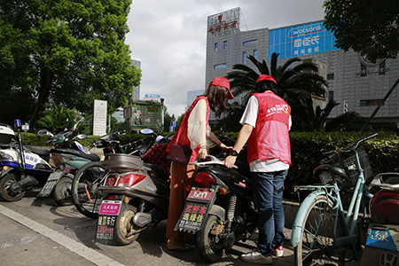 圖為志愿者將不規范停放的電瓶車挪到規范位置