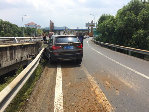 8月13日上午10:30分左右,臺(tái)州收費(fèi)所出口寧向匝道口有一輛黑色寶馬X3斜靠在護(hù)欄旁,其車頭左側(cè)因碰撞護(hù)欄而嚴(yán)重凹陷,左前輪胎報(bào)廢,所幸沒有人員傷亡。