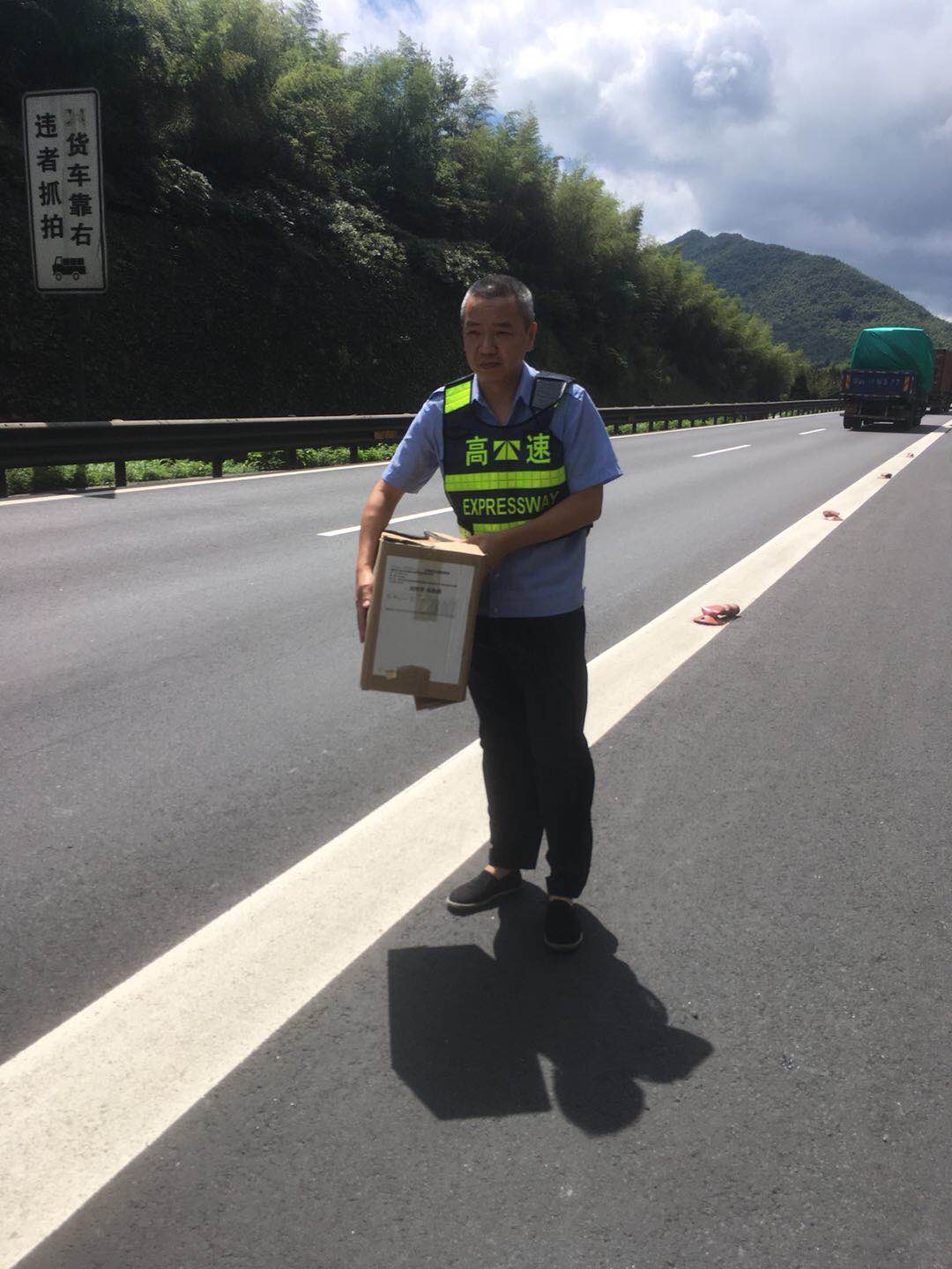 圖為執勤隊員搬走掉落在高速車道上的快件 “可是如何歸還快件呢?快遞小哥再來取,還是寄回?” 執勤隊員與物流公司負責人商量著。由于隧道所地處特殊位置,讓快遞小哥來隧道所領取肯定不方便,大家便提出將快件帶回臨海,再聯系順豐公司直接將快件寄給收件人。然而因紙箱掉落地面受過摩擦,使得快遞單破損且上面字跡變得模糊,一時無法確定相應收貨人聯系方式。 “沒有上面的信息,物流公司怎么在堆積如山的快件中查詢到這份快件的信息呢?”執勤隊員有點犯難了,他們告知物流公司物件重量,掉落地段,掉落的大致時間,并描述快件的外觀等依稀模糊的可辨特征,一次次不厭其煩的與物流公司溝通,終于根據模糊不清的外包裝相關信息確認了收件人的聯系方式。 物流公司在收到寄出快件的運單號時向執勤隊員連聲道謝:“這快件里面是汽車配件,很多是不容易配齊的專有型號,多虧了執勤隊拾得并歸還包裹,要不然丟失客戶單子賠錢挨訓是小,影響公司名譽就麻煩了。”隊長叮囑對方下次運送快遞時一定要放好物品,并注意安全。 毛譯聆
