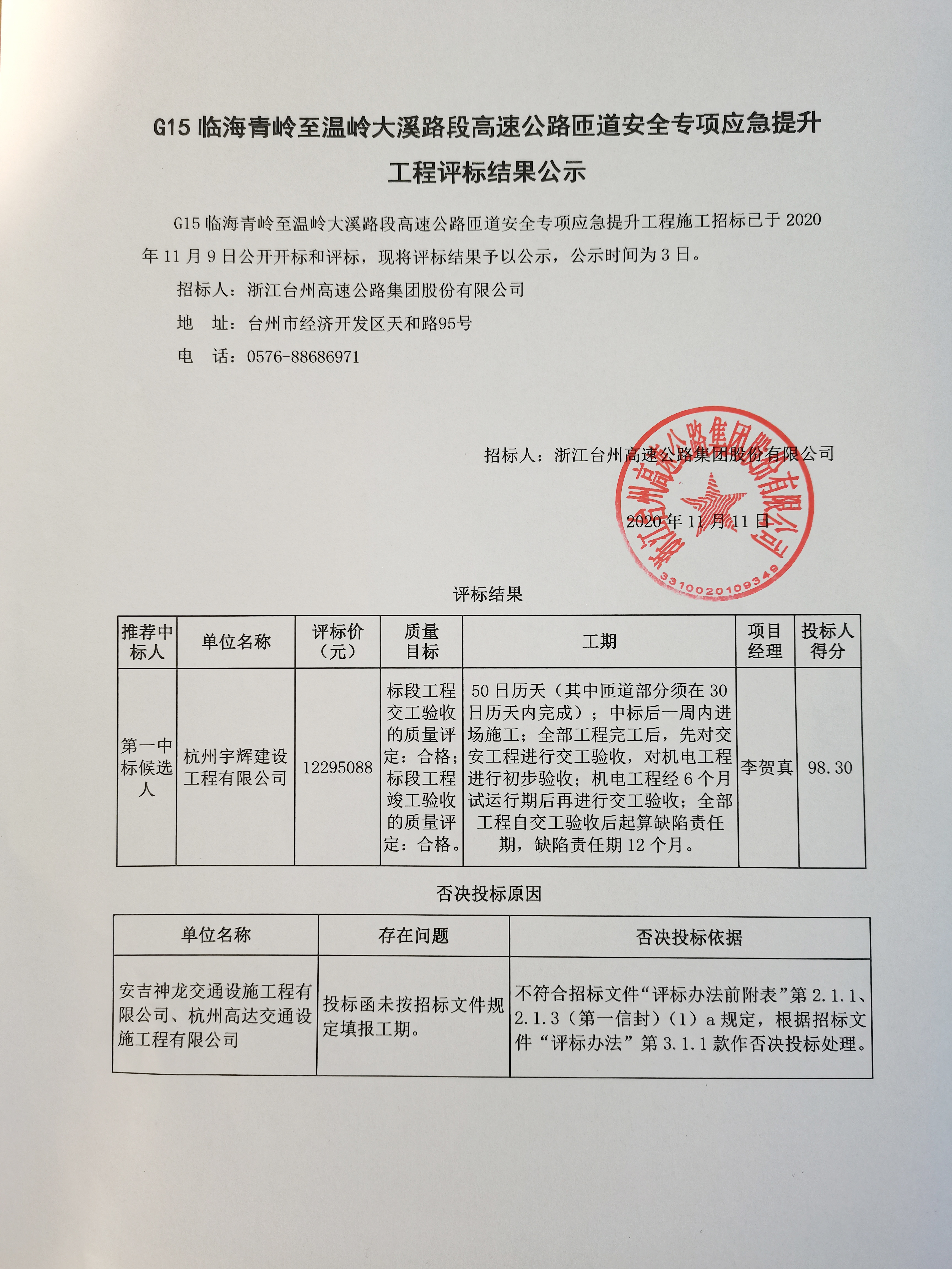 G15臨海青嶺至溫嶺大溪路段高速公路匝道安全專項應急提升工程評標結果公示