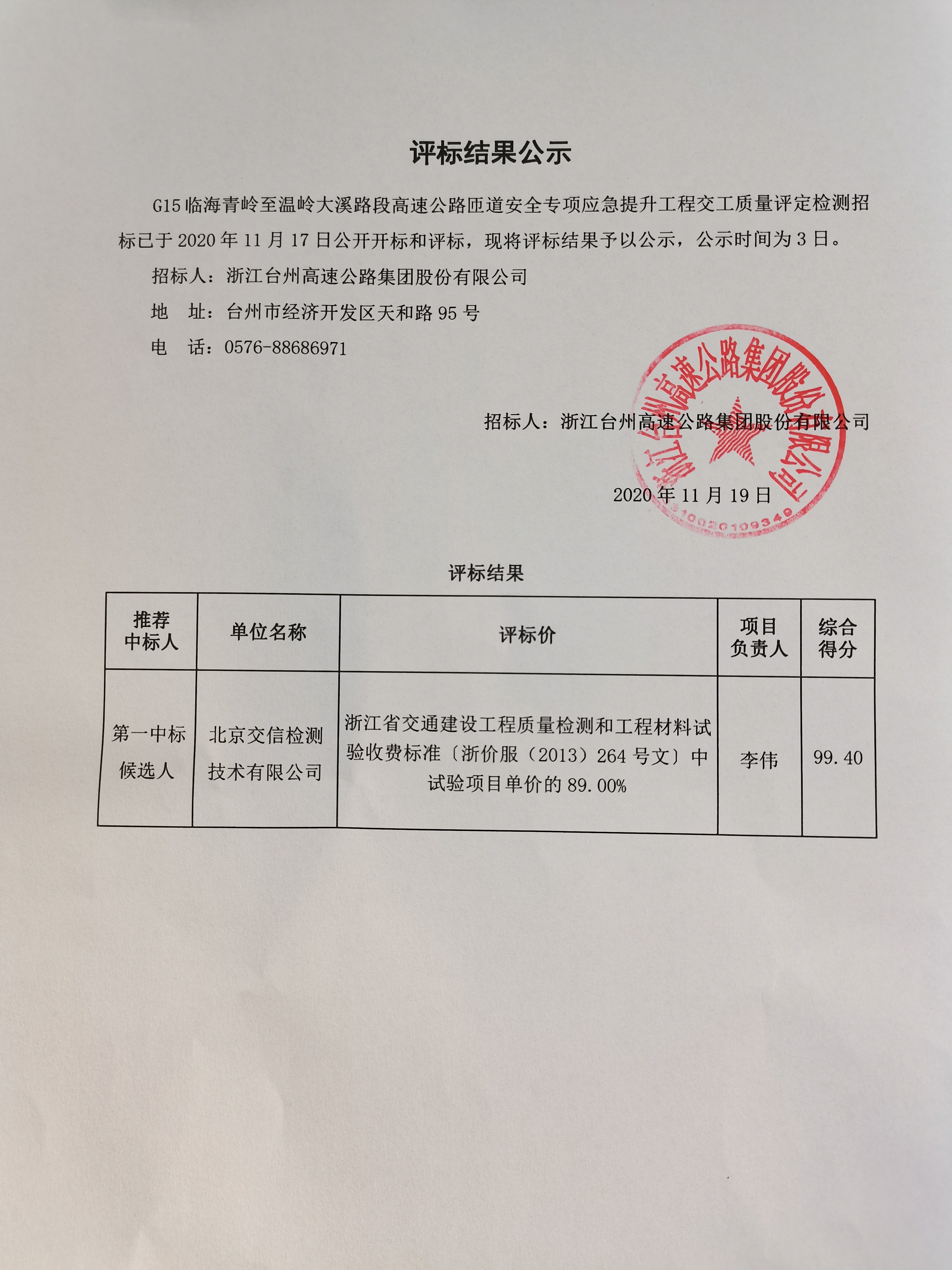 G15臨海青嶺至溫嶺大溪路段高速公路匝道安全專項應急提升工程交工質量評定檢測招標評標結果公示