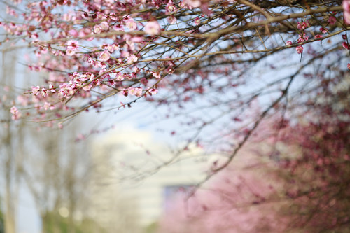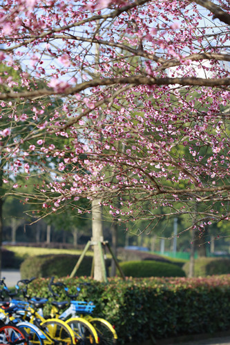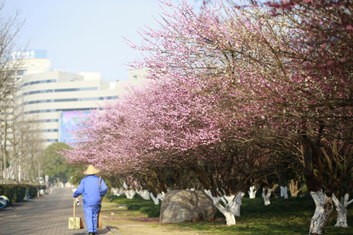 最后一站,便是市民廣場(chǎng),我見(jiàn)過(guò)的最美公交站臺(tái)。初春的清晨啊,一下車便有沁香拂散,迎接我下車的那是大片繁花盛開(kāi)呀,路邊草地一溜的紅梅、白梅,在藍(lán)天下絢爛地肆無(wú)忌憚地綻放。呵,是的,還有藍(lán)天,最近流行的一個(gè)詞叫“臺(tái)州藍(lán)”,忽然想起來(lái),每日公交車上下班,低碳出行,這算是我為“臺(tái)州藍(lán)”添了一筆淡藍(lán)嗎?應(yīng)該是吧。于是,在藍(lán)天紅白花海中,慢慢穿過(guò)梅林、小橋、亭子,上班之路竟是如此心情舒緩。 鄭蔚