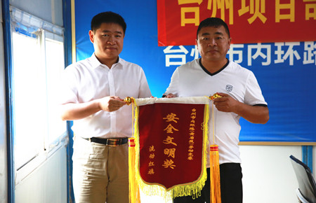 圖為為獲獎(jiǎng)施工單位頒發(fā)流動(dòng)紅旗